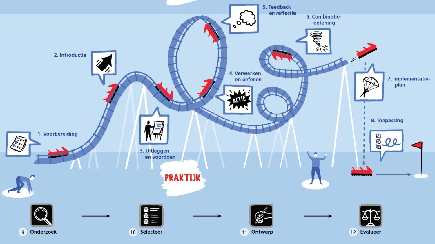 De trainingsachtbaan methodiek is daarbij een begeleidende methodiek waarbij we leren om vanuit 4 fasen en 8 bouwstenen elke leervraag te voorzien van een praktijkgerichte leeroplossing.